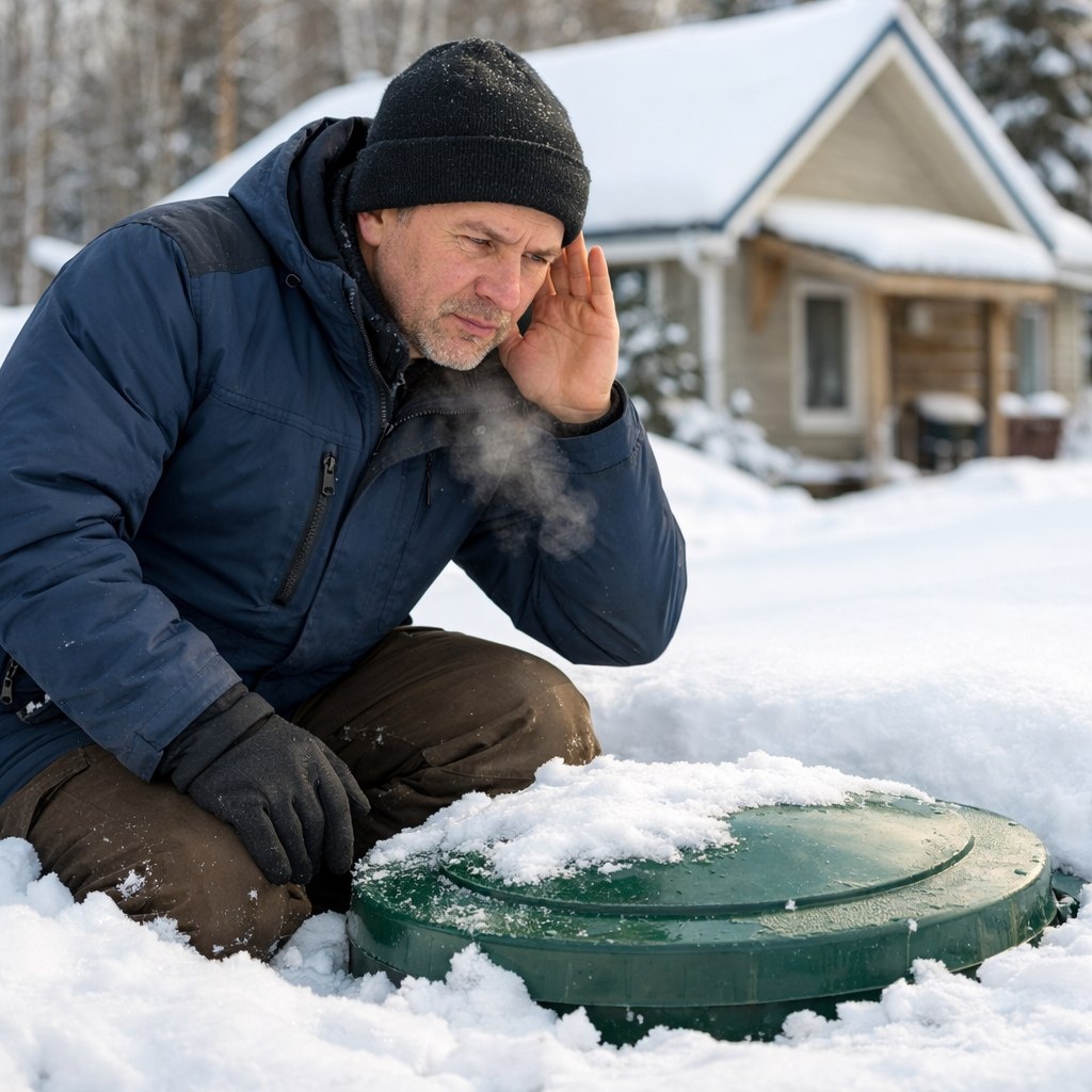 Выйдите на улицу и аккуратно откопайте люк септика (хотя бы немного, чтобы увидеть крышку). Обратите внимание на состояние снега вокруг и на самой крышке.