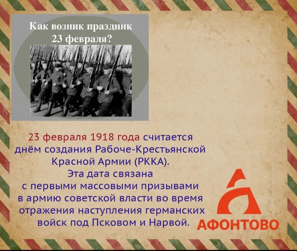 История возникновения праздника 23 февраля — неотъемлемая часть истории нашей страны. Она насыщена десятками государственных, политических и общественных событий, неоднократно меняющих судьбу нашего многомиллионного и многонационального народа. История 23 февраля, пусть и в краткой форме, известна и взрослым, и детям. Ведь День защитника Отечества — это не только дань памяти и почёта военнослужащим, но и настоящее торжество храбрых и отважных гражданских мужчин, готовых стать на защиту своей Родины в любой момент. Краткая история праздника в карточках телеканала «Афонтово».👆
