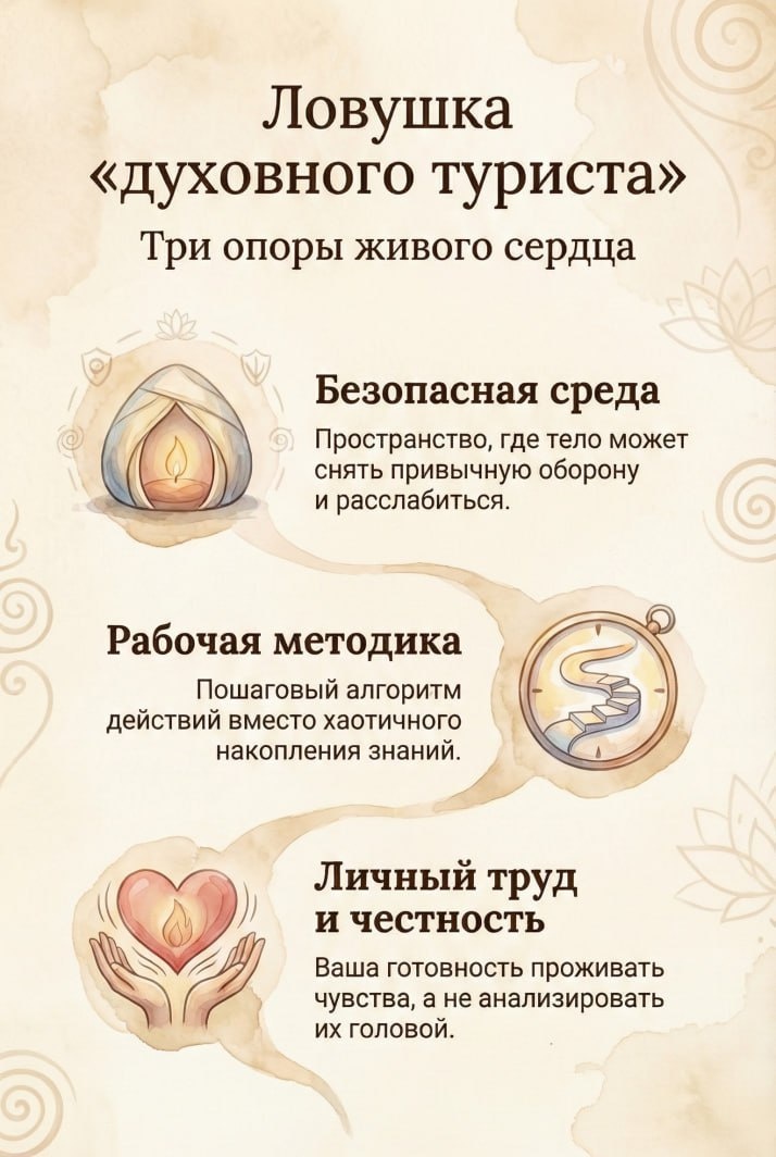 "Иван, я много лет в теме. Объездил Индию, работал с мастерами, прочёл кучу книг. Делаю всё правильно. Почему моё сердце до сих пор закрыто?" Я часто это слышу. И ответ обычно удивляет. Дело не в том, что вы мало стараетесь. Скорее наоборот. Проблема в том, что одного старания мало. И одной среды мало. Нужно и то, и другое. Смотрите, как это работает. Сердце закрывается от боли, от критики, от страха. Это не ошибка - это защита. Грудь сжимается, плечи поднимаются к ушам, дыхание становится мелким. Тело переходит в режим обороны. И пока оно обороняется - никакая техника не достанет до глубины. Поэтому среда важна. В токсичном окружении даже с лучшими инструментами сложно открыться. Человек закроется ещё больше. Но среда - это необходимое условие, а не достаточное. Если просто сидеть в "высоких вибрациях" 🧘♂️ и ждать, что сердце раскроется само - не раскроется. Нужен труд: честный, осознанный, с методикой и ответственностью за себя. Это как с олимпийским чемпионом. Он не едет сразу