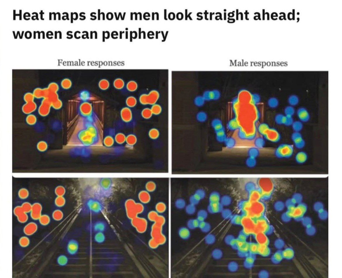— Женщины же сразу рассматривали периферию: кусты, края тротуара, тёмные зоны и любые потенциально опасные места, оценивая риски и