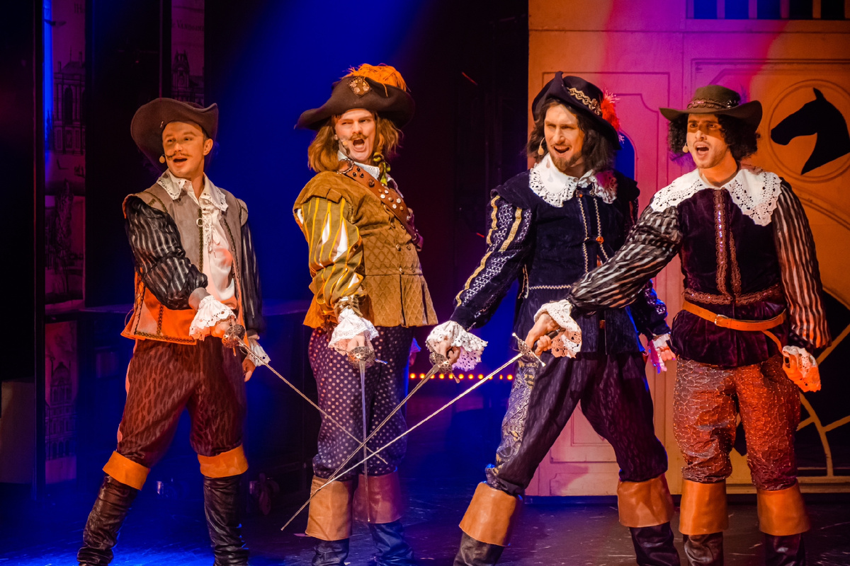 Классный мюзикл! Напелась просто от души! Знакомые песни приятно слышать и подпевать, а новые песни вносят изюминку в хорошо знакомую историю. Очень красивые костюмы (Художник по костюмам Анна Иткина)! Конечно, женщинам, Королю и Герцогу достались самые богатые) У мушкетёров тоже сложносочинённые образы со множеством деталей. Стоит отметить, что почти все артисты поют "вживую". Очень рекомендую всем, кто устал от сложносочиненных и многослойных спектаклей. Иногда нужно и такие постановки смотреть!)