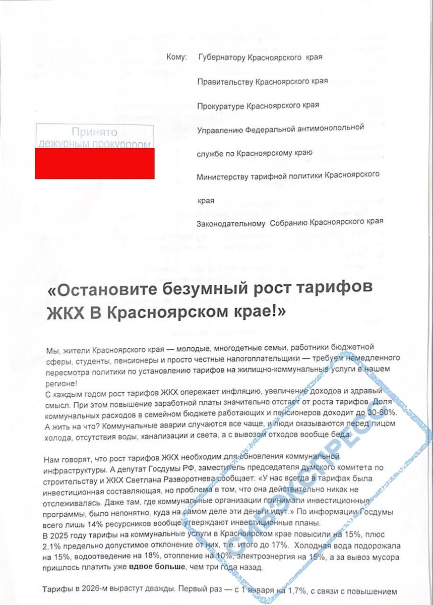 Жители Красноярска подали коллективные обращения в региональное правительство, ФАС и прокуратуру с требованием пересмотреть повышение тарифов ЖКХ в регионе. Копия письма оказалась в распоряжении «Сибирского экспресса». Авторы обращения предлагают пересмотреть расходы краевого бюджета на различные праздники и за счёт них компенсировать затраты поставщикам тепла и воды для населения. Активисты собрали около 1 тыс. подписей. Губернатор Красноярского края Михаил Котюков («Единая Россия») утвердил резкое повышение коммунальных тарифов в регионе. С 1 января 2026 они выросли на 1,7% во всех городах и поселениях, с 1 октября увеличатся в среднем ещё на 15-17,1%. По некоторым услугам ЖКХ общий рост будет выше усреднённых показателей — тарифы на холодную воду и стоки в Красноярске увеличат на 26,7% за год. 📌 Ранее вице-спикер заксобрания Новосибирской области Роман Яковлев (КПРФ) обратился в ФАС из-за жалоб населения на высокие начисления. О резком росте расценок сообщали и жители Иркутско
