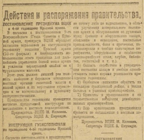 День учреждения праздника "День Красной армии" ПОСТАНОВЛЕНИЕ ПРЕЗИДИУМА ВЦИК о 4-ой годовщине Красной армии. В согласии с постановлением 9-го Всероссийского С'езда Советов о Красной армии, президиум ВЦИК обращает внимание исполкомов на наступающую годовщину создания Красной армии (23-го февраля) и необходимость использования этого праздника для дальнейшего укрепления боевой мощи армии и усиления неразрывной спайки ее с трудящимися массами. Этот день должен лишний раз выявить любовное и бережное отношение местных органов советской власти к нашей армии и их неустанное стремление к ее материальному и духовному совершенствованию. Празднование годовщины проводится согласно прилагаемой инструкции по соглашению с местным командованием. Председатель ВЦИК М. Калинин. Секретарь ВЦИК А. Енукидзе. ИНСТРУКЦИЯ ГУБИСПОЛКОМАМ по проведению 4-ой годовщины Красной армии. Согласно постановления о праздновании 4-ой годовщины Красной армии, президиум ВЦИК предлагает проведение следующих мероприятий: