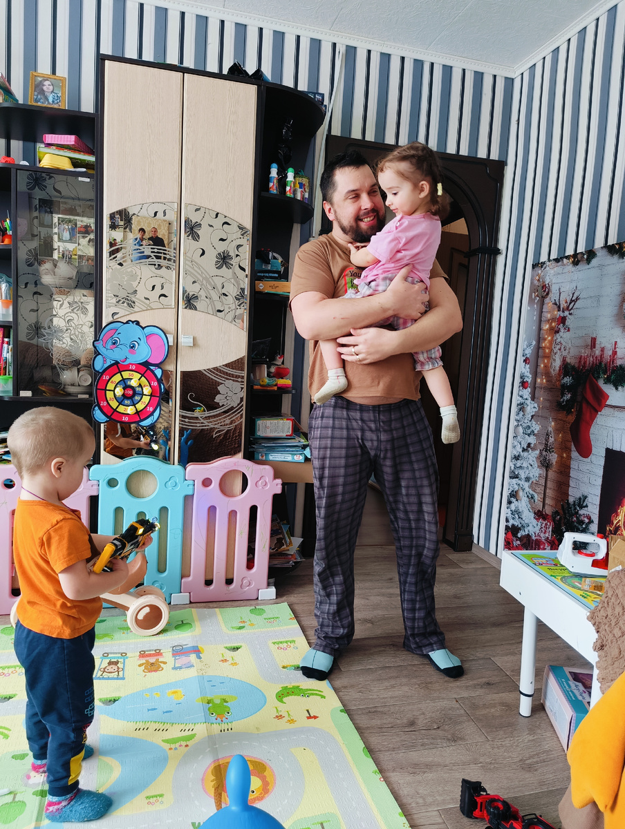 Амелия проснулась первой и сразу вопрос: " Папа не аехай? " Я сказала, что дома ещё. Она пошла к его двери, стала его звать, Севу разбудила. Сева проснулся не в настроении.
