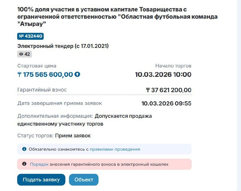 Футбольный клуб «Атырау» выставили на торги, сообщает SportCentralmedia24. 💬На площадке Sauda опубликовали лот о продаже 100% доли в уставном капитале ТОО «Областная футбольная команда «Атырау»». В настоящее время клуб находится на балансе управления физической культуры, спорта и туризма Атырауской области. Согласно информации в объявлении, в товариществе работают 125 человек. 📌Стартовая цена составила – 175 565 600 тенге. Гарантийный взнос для участия в аукционе – 37 621 200 тенге. Начало торгов назначили на 10 марта, в 10:00 утра. Фото: скрин с сайта Sauda Присылайте фото, видео и информацию анонимно — в наш бот t.me/CentralMedia24_KZbot или на WhatsApp +77080323818 😎Следите за новостями тут: https://dzen.ru/id/67fc8dffe608bc669477821e