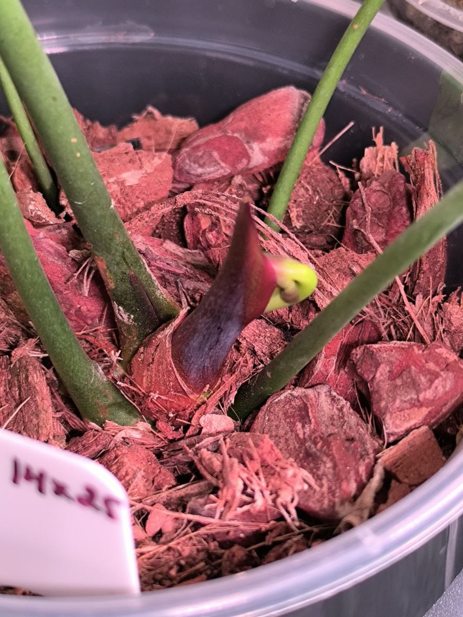 !.. 🤦 Первый лист за 5 месяцев! Надеюсь, выйдет и расправится целым, хватит силенок. 🤞 Каждый лист на счету, не смотря на высокую влажность. #антуриум_пелтигерум