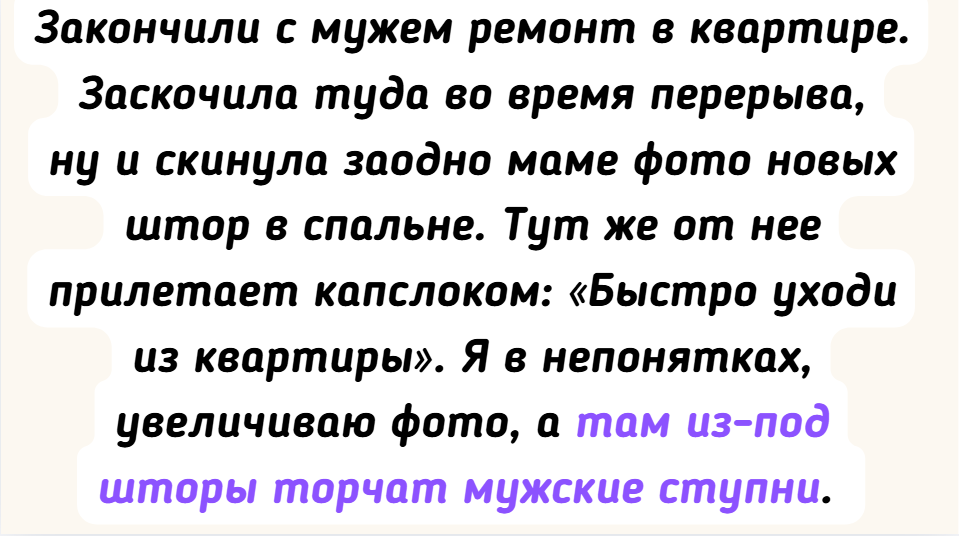 - Закончили с мужем ремонт в квартире. Заскочила туда во время перерыва, ну и скинула заодно маме фото новых штор в спальне. Тут же от нее прилетает капслоком: «Быстро уходи из квартиры». Я в непонятках, увеличиваю фото, а там из-под шторы торчат мужские ступни. Мне бы перепугаться, да только этот потенциальный грабитель почему-то стоял босиком. Резким движением отдернула шторы, а там муж. Ну а дальше ждать долго не пришлось — любовница (кстати, его коллега) отыскалась в гардеробной. Если б не мой внезапный визит и мама — Шерлок Холмс, то кто знает, сколько бы еще времени муж водил меня вокруг пальца.