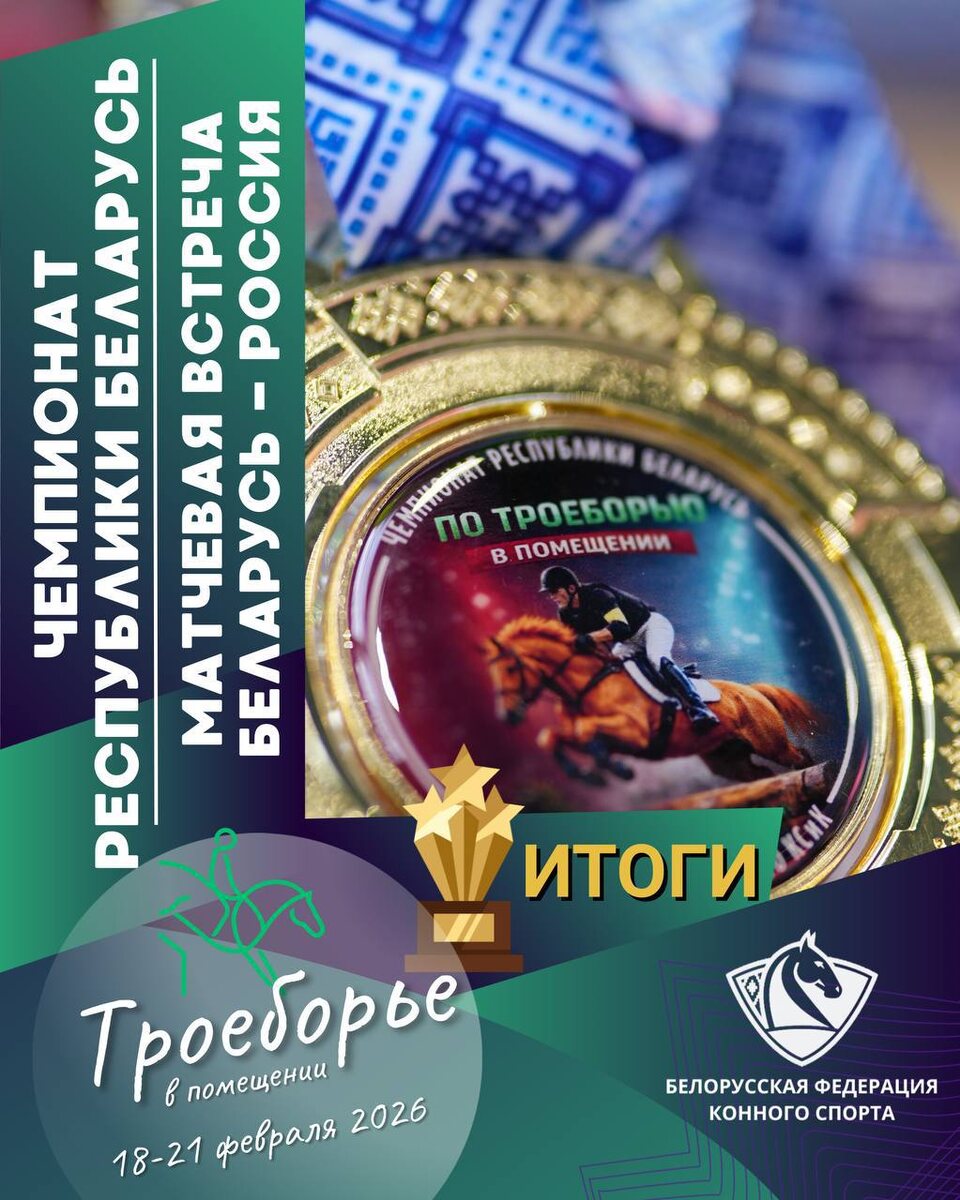 Чемпионом страны по троеборью в помещении стал Александр Фоминов на лошади Прогноз с результатом 27,80 штрафного очка. Серебро и бронзу завоевала Анастасия Шклянкова в паре с Декером и Диором. В рамках Матчевой встречи места распределились иначе: 🥇 Александр Фоминов (Беларусь 🇧🇾) и Прогноз — 27,80 ш.о. 🥈 Анастасия Михайлова (Россия 🇷🇺) — Хьюцилопотчли — 30,30 ш.о. 🥉 Анастасия Шклянкова (Беларусь 🇧🇾) — Декер — 31,80 ш.о. В командном первенстве победу одержала сборная Беларусь-1, набрав 59,60 штрафного очка (Александр Зеленко, Александр Фоминов, Анастасия Шклянкова).