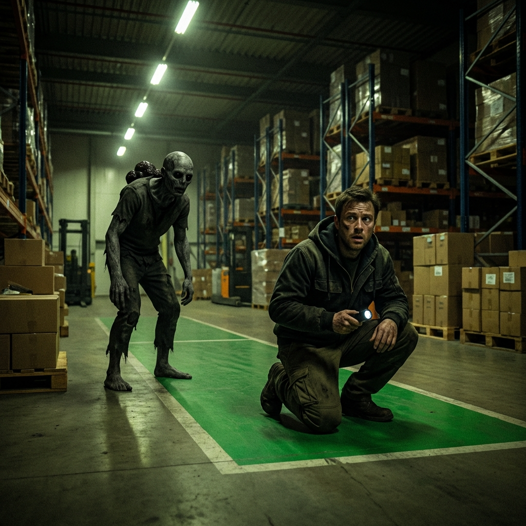 Он простоял в зелёной зоне сорок минут, до 00:55, боясь пошевелиться. За это время ничего не произошло. Абсолютно ничего. Но именно это «ничего» пугало сильнее любых звуков — склад словно вымер, даже собственное дыхание казалось чужим.