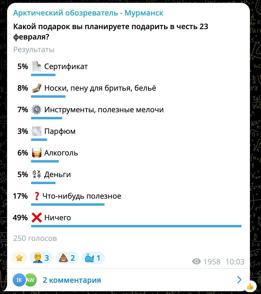 Почти половина опрошенных не планировали дарить подарки на 23 февраля. Это следует из результатов опроса, проведённого «АО» накануне праздника. Из всех предложенных вариантов ответ «Ничего» набрал 49%. Следующий по популярности вариант – неопределённый «Что-нибудь полезное» – за него проголосовали 17%. Остальные варианты – Сертификат, носки, пену для бритья, парфюм, полезные мелочи и алкоголь – набрали в общей сложности менее 35%. ❄ «Арктический Обозреватель»