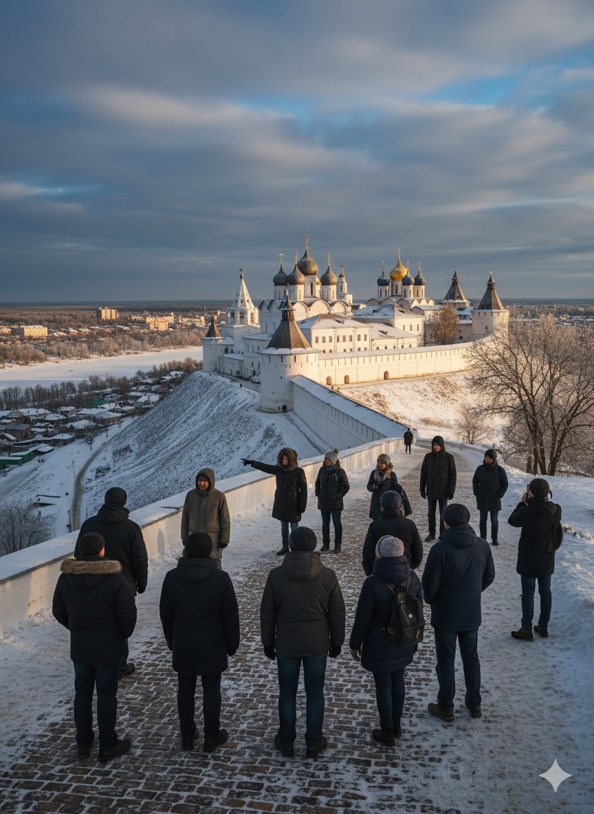 Тобольск основали в конце XVI века как опорный пункт освоения Сибири, и долгое время здесь стоял деревянный острог. После большого пожара из Москвы пришёл указ строить из камня — так началось почти столетнее строительство ансамбля. В итоге кремль вырос в настоящий город внутри города: Софийско-Успенский собор, Гостиный двор, Дворец наместника, Рентерея и Тюремный замок — всё это единый комплекс. По легенде, «ссыльный колокол» из Углича, которому вырвали язык за то, что он сзывал народ после убийства царевича, много лет пребывал именно здесь.