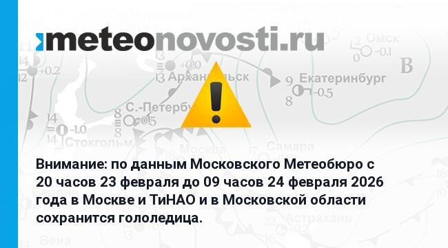 Внимание: по данным Московского Метеобюро c 20 часов 23 февраля до 09 часов 24 февраля 2026 года в Москве и ТиНАО и в Московской области сохранится гололедица.