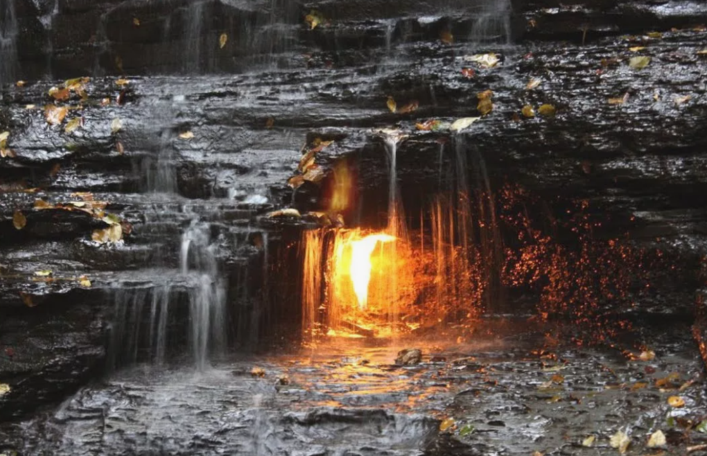 Мы привыкли к тому, что Вечный огонь зажигают люди в память о важных исторических событиях. В нашей стране он горит на центральных площадях многих городов, а в столице у могилы Неизвестного солдата. Однако в мире существуют места, где пламя поддерживает сама природа. Это происходит там, где природный газ выходит на поверхность земли и воспламеняется естественным образом. Подписывайтесь, чтобы не пропустить новые и интересные статьи: На разных континентах насчитываются тысячи участков, где из недр просачивается газ, способный гореть непрерывно. Но в Соединенных Штатах есть по-настоящему необычный объект, в котором соединяются две стихии. Огонь и вода сосуществуют одновременно, а пламя скрыто прямо внутри водопада. В глубине Честнат-Ридж, неподалеку от города Буффало в штате Нью-Йорк, можно увидеть это редкое явление. Особенность места заключается в том, что источник пламени находится прямо под потоками воды. В самом центре так называемого Водопада Вечного огня мерцает естественное п