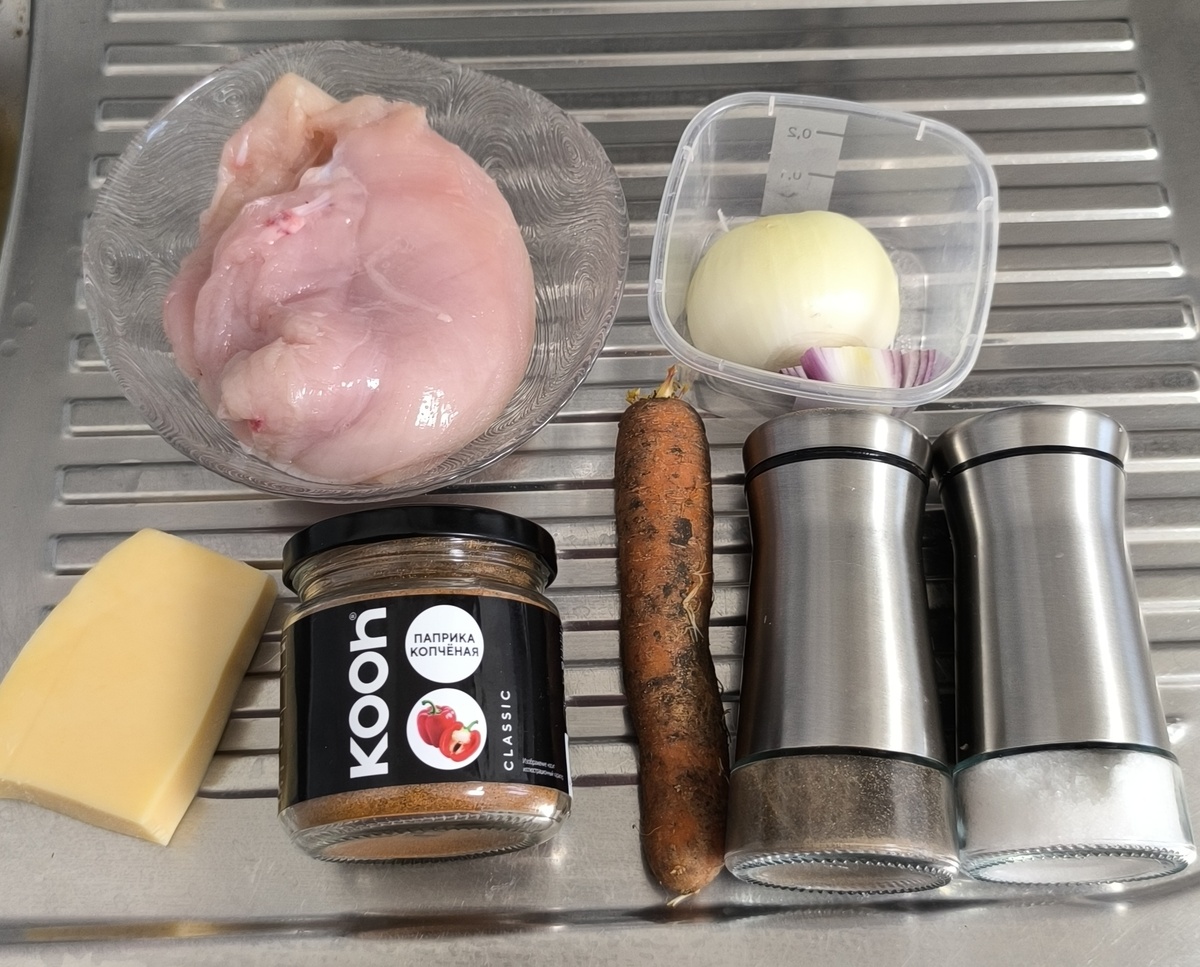 Поместите куриное филе, сыр и подготовленные овощи в чашу блендера.
