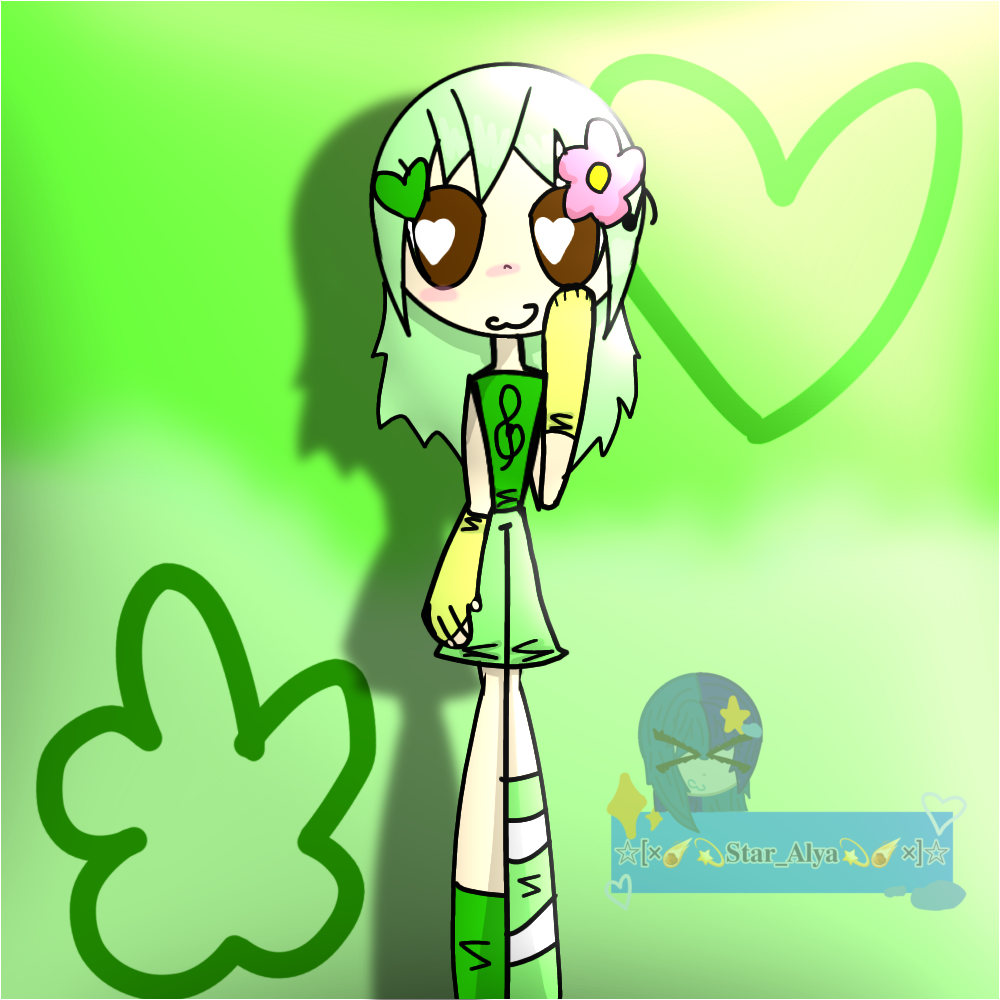 У неё зелёные волосы; на голове заколки в виде цветка, сердца и нотки; у неё карие глаза, в глазах зрачки в виде сердечка; одета в зелёную майку, на майке изображён скрипичный ключ; светло-зелёные шорты; в жёлто-зелёные митинки; в зелёно-белый гольфик и в зелёный носок.