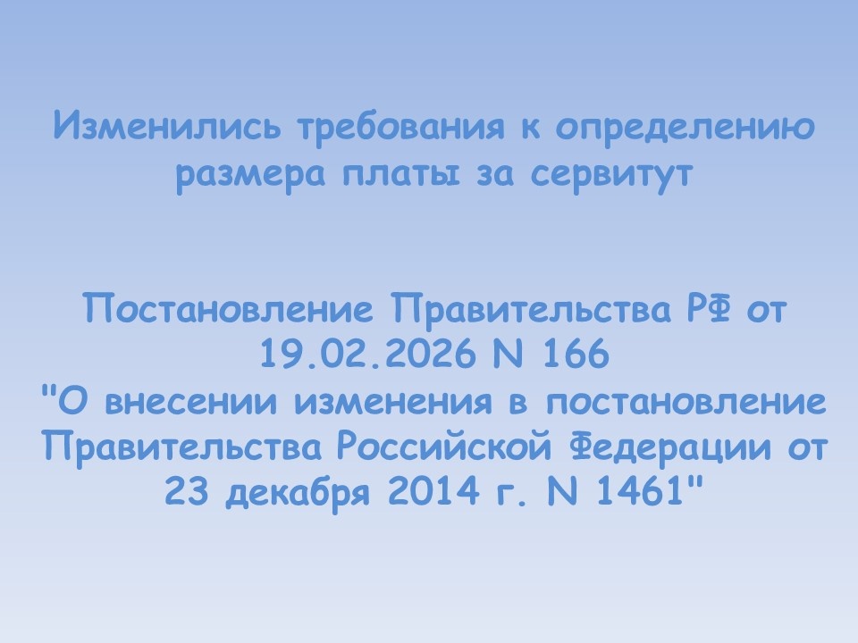 Размер платы за установление сервитута определяется в соответствии с Правилами, которые утверждены постановлением Правительства РФ от 23.12.2014 N 1461. Основная мысль этих Правил сводится к тому, что размер платы рассчитывается как 0,01 процента кадастровой стоимости земельного участка за каждый год срока действия сервитута. Отдельная норма регулирует порядок установления платы за сервитут на земельный участок, находящийся в федеральной собственности. И вот с 27 февраля 2026 года изменяется подход в определении размера платы за сервитут (смотрите Постановление Правительства РФ от 19.02.2026 N 166 "О внесении изменения в постановление Правительства Российской Федерации от 23 декабря 2014 г. N 1461"). Изменяется следующее: размер платы 0,01 % кадастровой стоимости земельного участка сохраняется, но только для двух случаев: а) если земельный участок не обременен правами третьих лиц; б) если земельный участок предоставлен органу государственной власти, либо органу местного самоуправления,