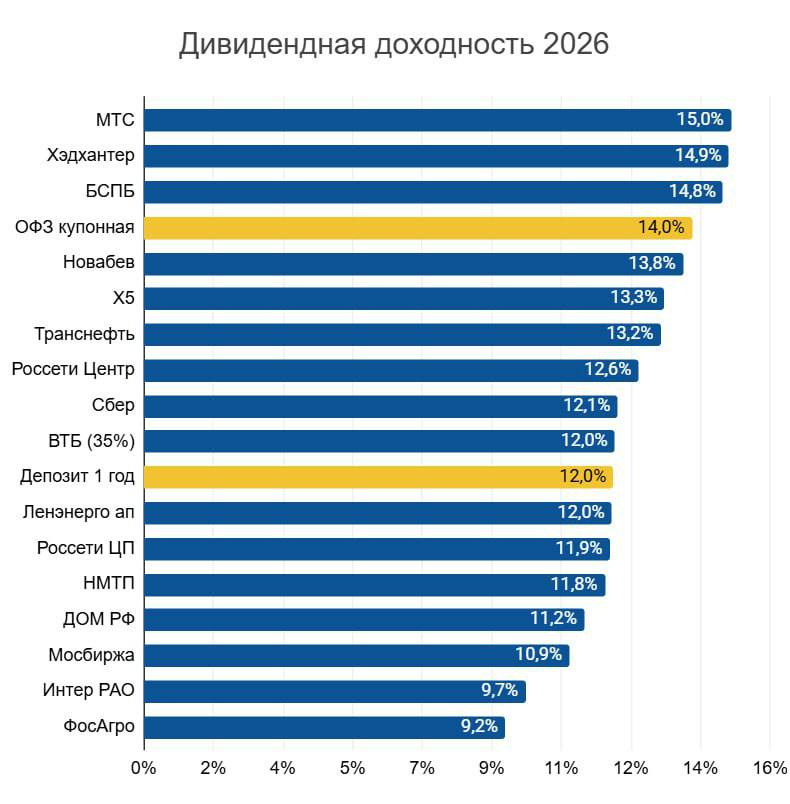 ❗Кто покажет наибольшую див.доходность? 2025 год закончился и вскоре начнут давать рекомендации по дивидендам за весь прошлый год / за 2 полугодие 2025 года. 👉Наибольшую див.доходность ГАРАНТИРОВАНО покажут следующие компании: 📱МТС Дивиденд за 2025 год — 35₽. Доходность 15% 🔖 Хэдхантер. Ожидаю общий дивиденды за 2025 год, включая промежуточный за 1П — 233₽, около 410-480₽. Доходность до 15%. ⛽️Транснефть . Дивиденд за 2025 год 180-195₽. Доходность до 13,2%. 🏦 Сбербанк. Дивиденд за 2025 год 37,5-38₽. Доходность около 12%. 🔌Ленэнерго . Дивиденд за 2025 год 36,9₽. Доходность 12%. Также я выше прикрепил картинку с наибольшими див.доходностями за 2025 год. ❗️В списке не указаны компании по типу Х5, Новабев, БСПБ или ВТБ, так как уровень див.доходности под вопросом и зависит от того, сколько направят прибыли на дивиденды. На картинке рассмотрены наилучшие сценарии. Если тебе понравился этот пост, поддержи его лайком 👍 и комментарием, также советую подписаться, я рассказываю много пол