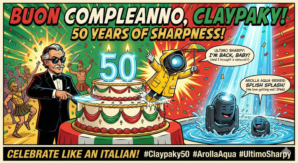 Вот вам порция итальянского безумия! Claypaky решили отметить свой полувековой юбилей не тортиком со свечками, а залпом из всех световых орудий. Держитесь крепче, будет ярко и немного мокро! Официальный слоган юбилея (мы так думаем): «Старый конь борозды не портит, особенно если этот конь — Sharpy!» Итальянцы доказали, что возраст — это всего лишь цифра в паспорте прибора. На свой 50-й день рождения они не стали просить пенсию, а выкатили линейку Arolla Aqua, которая готова к вечеринке в любом бассейне. Защита IP66. Это значит, что приборы можно поливать просекко, ронять в фонтан Треви или просто оставить под проливным дождем — им будет все равно. Они как те итальянские мачо, которым идет даже мокрая рубашка. Он вернулся, чтобы снова колоть ваши сердца (и глаза). Помните тот самый Sharpy, который изменил мир? Так вот, он прошел курс омоложения, подкачался и купил себе непромокаемый плащ. Итог: Claypaky в свои 50 лет ведут себя как подростки-бунтари: лезут в воду, светят в глаза и возвр