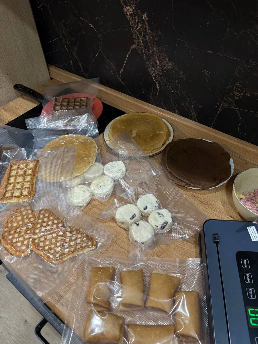 🤭 Что приготовила: 🕙Сырники с клубникой и маком (5 шт) 🕙Сырники с изюмом (4 шт) 🕙Сырники с бананом и клубникой (5 шт) 🕙Вафли с бананом и клубникой (2 большие) 🕙Вафли с кабачком и сыром (5 мини и 1 большая) 🕙Блины классические без начинки (в заморозку 10 шт) 🕙Какао-блины без начинки (в заморозку 10 шт) 🕚Блины с ветчиной и сыром (для нас с мужем, 6 шт) + остались блины на чаепитие семьи 💛 Активное время готовки: ~ 1,5 часа , если не учитывать блины, то 30 минут На сырники: 🕤3 брикета по 200 гр творога 5% = 600 гр 🕤3 желтка 🕤~ 8 ст.л рисовой муки 🕤~ 40 гр изюма 🕤2 ст.л мака 🕤5 ст.л субл. клубники без горки 🕤1/2 спелого банана На вафли: 🕤2 яйца 🕤1 кабачок небольшой 🕤80 гр сыра 🕤1 банан 🕤2 ст.л субл.клубники 🕤~ 3 ст.л муки пшеничной (на сладкие вафли) 🕤~ 5 ст.л муки рисовой (на вафли с кабачком) 🕤Специи На блины: /по рецепту 3 стакана/ 🕤6 яиц 🕤2 стакана муки 🕤2 стакана молока 🕤2 стакана кипятка 🕤Сода ~ ч.л. 🕤Разрыхлитель, соль, сахар 🕤2 ст.л растительног