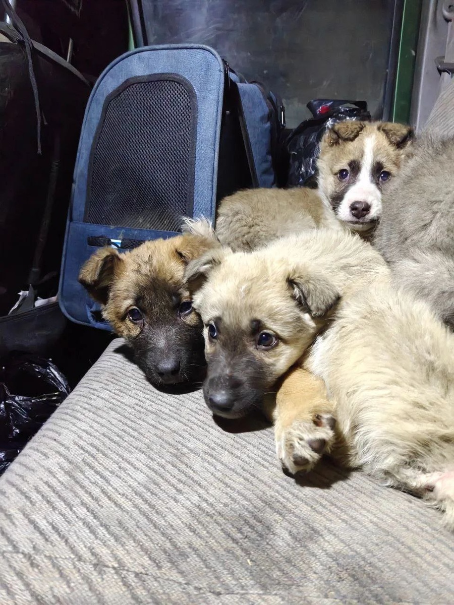 При встрече с малышами у меня трепетало сердце. Они как будто всё поняли! Четыре мальчика и одна девочка, все очень контактные, ласковые, нежные детки! Они принялись лизать нам руки и лица, будто почувствовали, что мы хотим им помочь, обогреть, дать им кров, подарить любовь, заботу и шанс на счастливую жизнь. Эти чувства не передать словами… Вместе с нежностью накатило негодование, злость, ненависть к человеку, поступившему с ними так жестоко!!! Щенкам уже около двух месяцев. Они явно метисы кавказской овчарки, то есть, эти малыши родились у чьей-то домашней собаки, росли рядом с человеком, кушали молочко и грелись ночами рядом с такой родной, заботливой мамочкой, и в один миг их сгребли в охапку и вот так запросто вышвырнули у трассы в надежде на то, что никто их там не найдёт, что сгинут они под колёсами машин, что они замёрзнут там насмерть или погибнут от голода…
