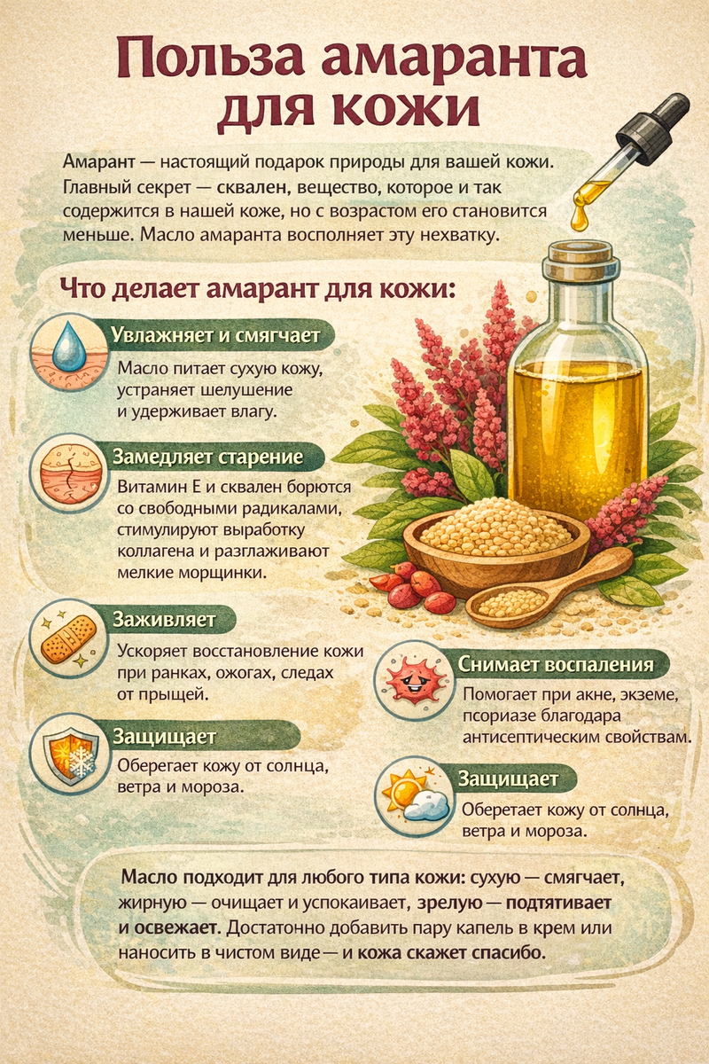 Амарант — настоящий подарок природы для вашей кожи. Главный секрет — сквален, вещество, которое и так содержится в нашей коже, но с возрастом его становится меньше. Масло амаранта восполняет эту нехватку.