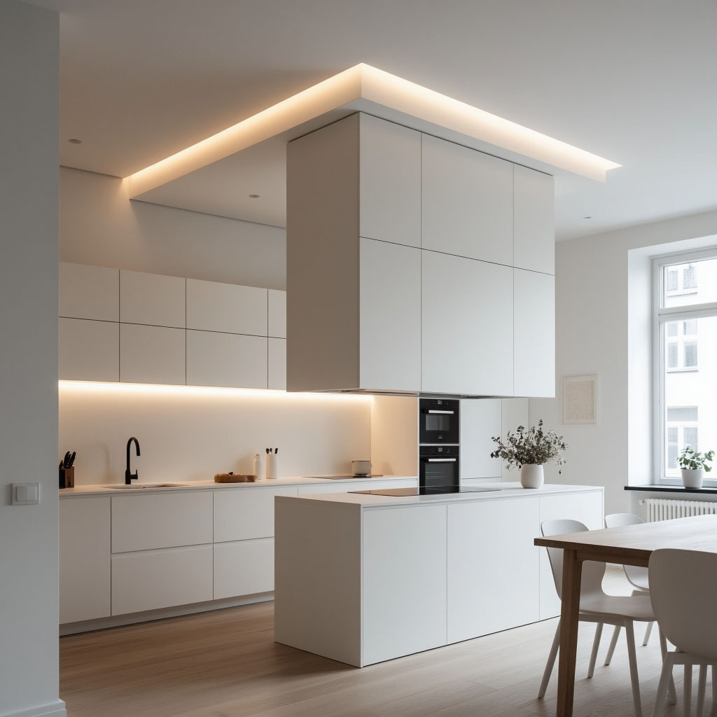 - · Сложность со светом: Встроенные светильники в штукатурку не монтируют (разве что накладные). Только люстра по центру. А люстра на кухне сегодня — часто не самое удобное решение (светит в спину, создает тени у рабочих поверхностей).