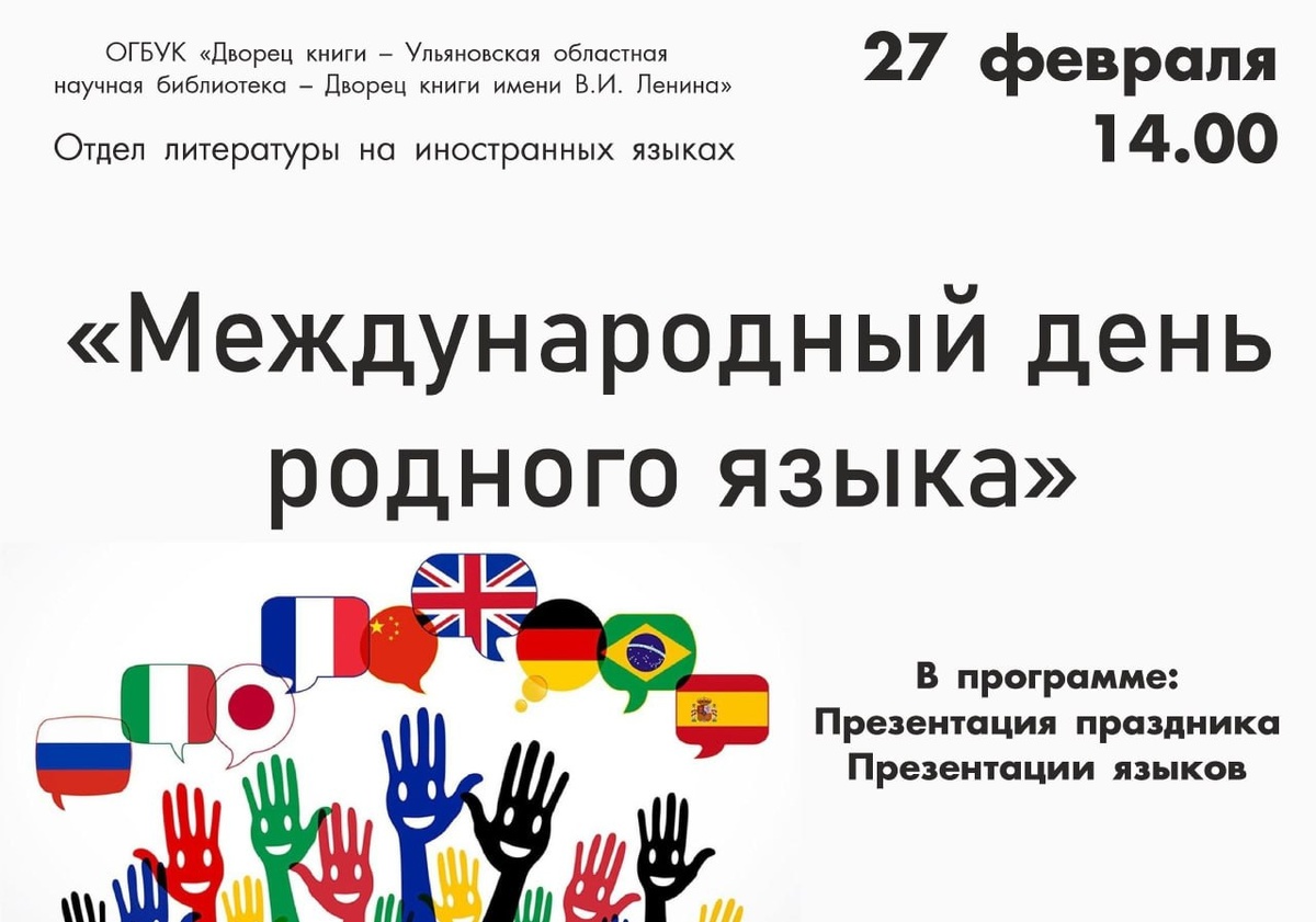 Студенты УлГУ из Египта, Индии, Омана и Туркмении 27 февраля в честь Международного дня родного языка расскажут о своём языке и диалектах. Дворец книги приглашает всех желающих. Участники смогут узнать интересные факты и попробуют выучить новые для себя слова. Оперативные новости в МАХ