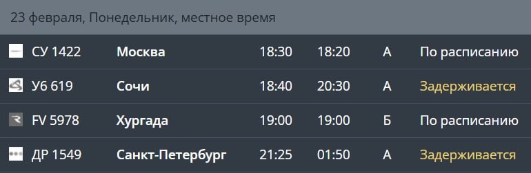 Сегодня с опозданием прибудут самолеты из Сочи и Санкт-Петербурга. Переносят, соответственно, и обратные вылеты.