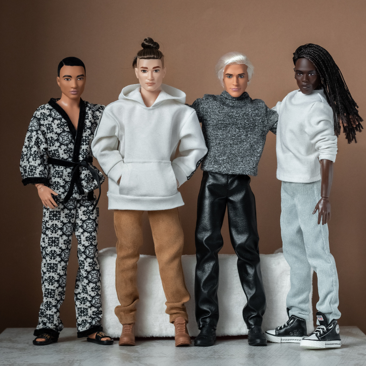 Мужской фотодень. Кенов у меня, как видно на общем фото, немного. Поэтому решиться сделать общее фото мне было легко. Даже Брендона не переодела, так и остался в пижаме (ну и у него этим летом были свои сложные моменты с переодеванием))). Джон - самый фотографируемый кен. И самый любимый. Гослинг - новичок на полке. Пока свободен) Или он определиться не может. или девочки всё ждут еще кого-то и пока не видели фото нового Кена Basics. Харлей. С ним фотосессий у меня меньше всего. Летом брала его в поездку с рыжей Андрой для фотосессии в СНТ. Ну и Брендон. Хорошо смотрится в образах от комичного до сильно делового))) Тут про переодевание Брендона)):
