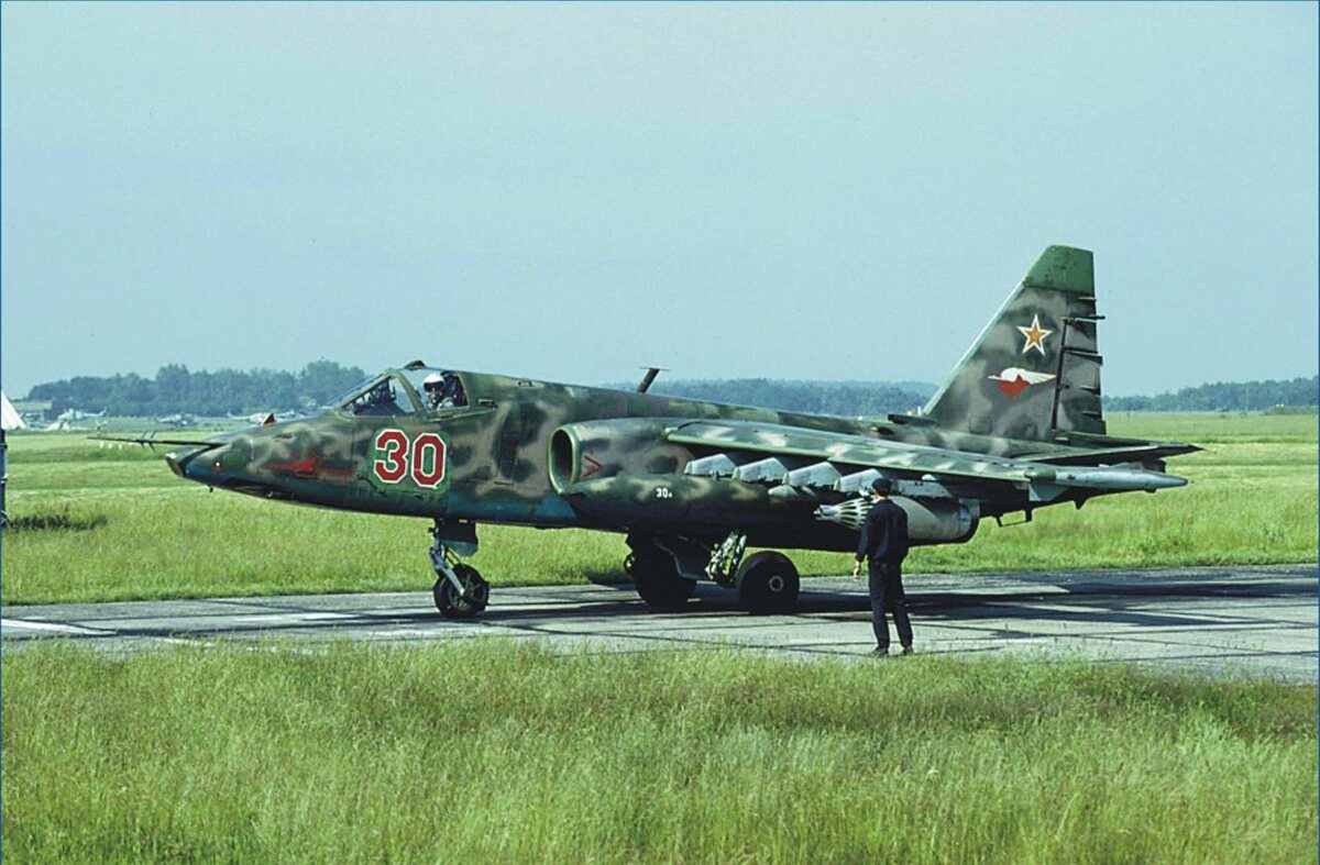 Самолёт Су-25 б/№ 30 "красный" 357-го отдельного штурмового авиаполка 16-й воздушной армии ВВС СССР на аэродроме Брандис, ГДР, снимок сделан