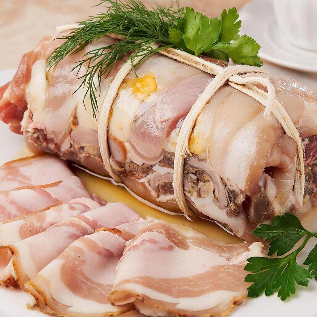 Руляда из поросенка – это своего рода мясной рулет, приготовленный из специально подготовленной свиной кожи с тонким слоем мяса. Внутри она начиняется разнообразными деликатесами, такими как язык, печень, ветчина и яйца, а также обогащается желатином для придания идеальной текстуры. В результате получается плотное, но нежное блюдо с богатым и многогранным вкусом.