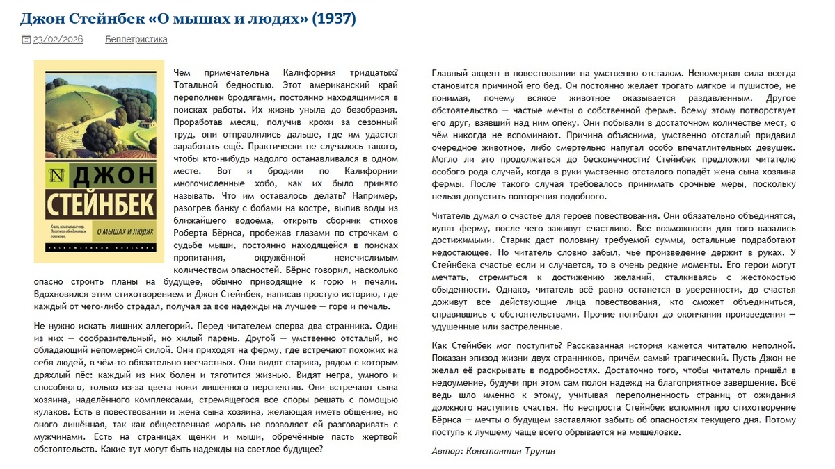 Джон Стейнбек «О мышах и людях» (1937) | Критика