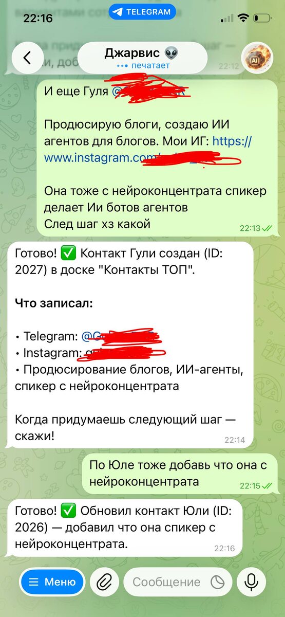 месяцы я понял что все решения на вытянутой руке. Возможно под этим постом будет такое: Ваааау, я тебя как раз искал(а) 👇🫶👇 Я начну тут: занимаюсь сейчас разработкой приложений и автоматизацией бизнеса с AI инструментами, на скрине можешь видеть моего ИИ агента которого обучил голосом: делать самари в чатах, ставить задачи в WEEK и вести их, присылать мне дайджест, приоретизировать мои дела, писать брифы, общаться с клиентами, вести базу контактов с мероприятий и назначать встречи по календарю. дальше будет внедрение сложных Многошаговых задач типа налей кофеек вести срм, управлять рекламой, кодить, бронировать И так далее ) 🔥 — Кстати с 23м мужчины! #ии #gpt #манкетинг