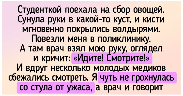 - Студенткой поехала в колхоз на сбор овощей. Сунула руки в какой-то куст, и кисти мгновенно покрылись зудящими волдырями. Повезли меня в районную поликлинику. А там врач взял мою руку, оглядел и кричит: «Идите! Смотрите!» И вдруг несколько молодых медиков быстренько сбежались смотреть. Я чуть не грохнулась со стула от ужаса. Врач, видимо, понял, что сейчас будет сцена обморока, и пояснил: «Ничего страшного. Яркий случай аллергического дерматита. Они такое только в учебнике увидеть могут». © Yulia Alexander