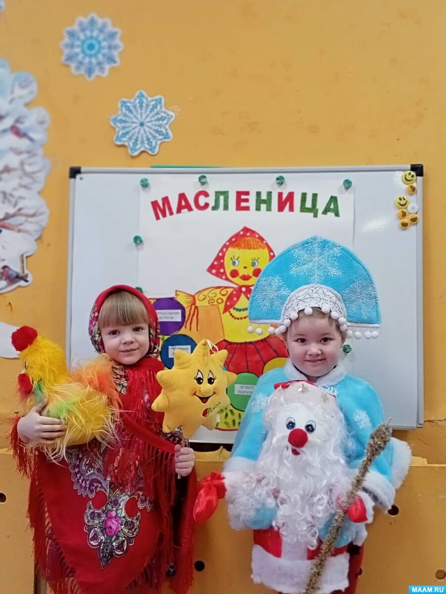 Масленица — это старинный праздник, который отмечают не только в нашей стране. В этот день зиму провожают, а весну встречают. Первый день Масленицы так и называется — Встреча. В этом году Масленица ранняя — началась 22 февраля. Мороз не хочет уходить, наметал горы снега, перемёл все дорожки, но солнышко уже припекает, петушки просыпаются и зовут гулять. Послушали песню «Масленица». На Масленицу пекут блины целую неделю. Блин означает солнышко. Наши блины улыбаются и приглашают их отведать. Спели песню: «Ой, блины, блины, блины!». Второй день Масленицы называется Заигрыш. Мастерят Масленицу и выставляют на окно, чтобы спасало от злых духов. В среду у нас — Лакомка. Угощаемся блинами, баранками, вкусными печеньками, разными конфетами, да попиваем чаёк. С большими баранками поиграем. Проводится игра «Кто скорее соберёт?». На Масленицу принято всех угощать. Вот и мы по садику пошли и угощали конфетами да бараночками. А в четверг у нас — «Разгуляй». На улице мороз, а нам весело играть. Снач