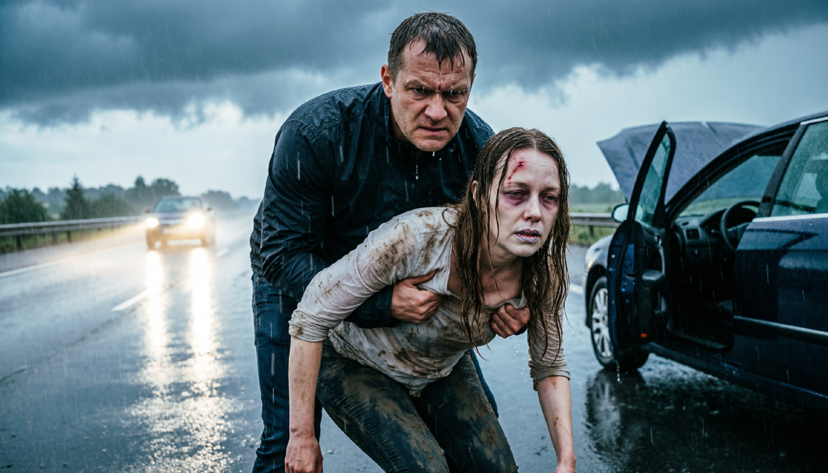 То, что он увидел, заставило его кровь застыть в жилах. У самого края кювета, прижавшись к грязному отбойнику, сидела женщина. Она была одета в легкое летнее платье, которое мгновенно промокло и прилипло к телу, обнажая синяки и ссадины. Лицо ее было искажено болью и страхом, один глаз заплыл так, что почти не открывался, а из разбитой губы сочилась тонкая струйка крови, смешиваясь с дождевой водой. Она дрожала мелкой, неконтролируемой дрожью, словно лист на ветру.