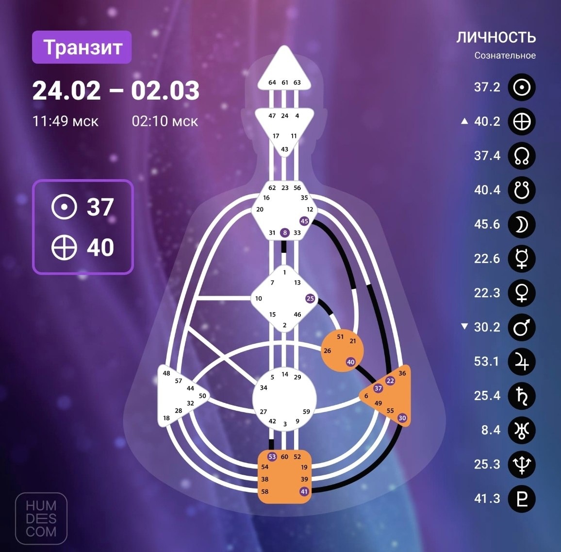 ▶️ с 24 февраля (11:49 мск) ⏹️ по 2 марта (02:10 мск) Солнце в 37 Воротах Дружбы Земля в 40 Воротах Одиночества Общение с семьёй и близкими редко долго бывает гладким, и пришло время обратить на это внимание. Конфликты и вопросы, которые вы раньше успешно избегали, дадут о себе знать, и это хорошо — сейчас вы можете решить их раз и навсегда. Это время чистки жизненного пространства и отношений с людьми: какое-то общение будет заканчиваться, какое-то — трансформироваться, и только ваше внутреннее Я останется прежним. Полагайтесь на себя, следуйте за своими искренними желаниями, проявляйте заботу и внимание к близким и будьте, наконец, мягче. Помните, что «нежными словами и добротой можно на волоске вести слона». Этот транзит учит проявлять своё женское начало (даже если вы мужчина) и радоваться свободе и расслаблению. Не бойтесь быть излишне податливым в это время, это не будет длиться вечно, а вот вы можете открыться себе с новой стороны. Каждый транзит прекрасен тем, что показывае