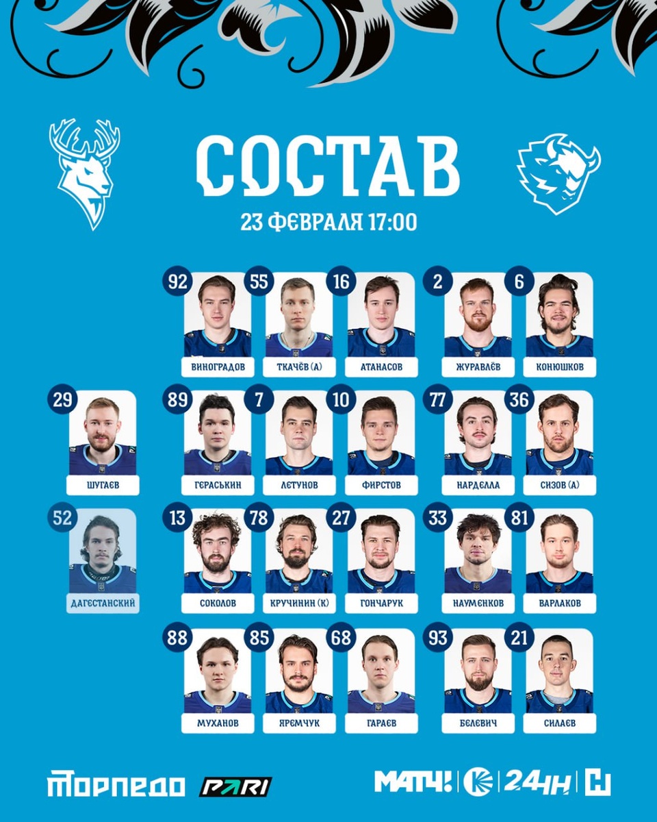 В День защитника Отечества цвета «Торпедо» будут защищать следующие хоккеисты 👏