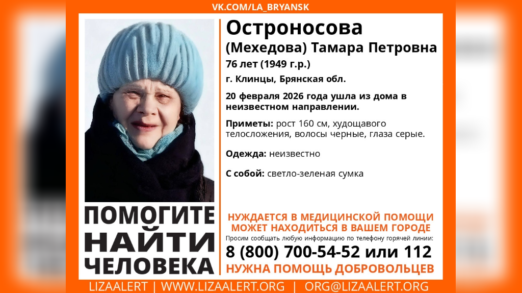 О ней ничего неизвестно с 20 февраля. Волонтеры поисково-спасательного отряда «Лиза Алерт» сообщают, что пенсионерка нуждается в медицинской помощи. Всех, кто что-либо знает о ее местонахождении, просят позвонить по телефонам: 8 (800) 700-54-52 или 112. В Клинцах Брянской области пропала 76-летняя Тамара Остроносова. О ее местонахождении ничего неизвестно с 20 февраля 2026 года. К поискам подключились волонтёры отряда «Лиза Алерт». Они распространили в социальных сетях ориентировку. Тамара Петровна нуждается в медицинской помощи. Всех, кто что-либо знает о ее местонахождении, просят позвонить по телефонам: 8 (800) 700-54-52 или 112. Напомним, в регионе ищут без вести пропавшего 70-летнего Николая Гришукова. О местонахождении пенсионера ничего не известно с 4 июня. В Брянске пропала 76-летняя Тамара Остроносова
