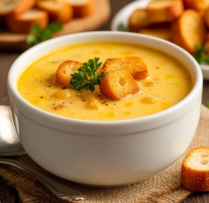 Сухарики в сырном супе — не просто украшение, а полноценный ингредиент, создающий игру текстур. Хрустящие, ароматные, они контрастируют с нежным бархатистым супом и делают каждый глоток интереснее.