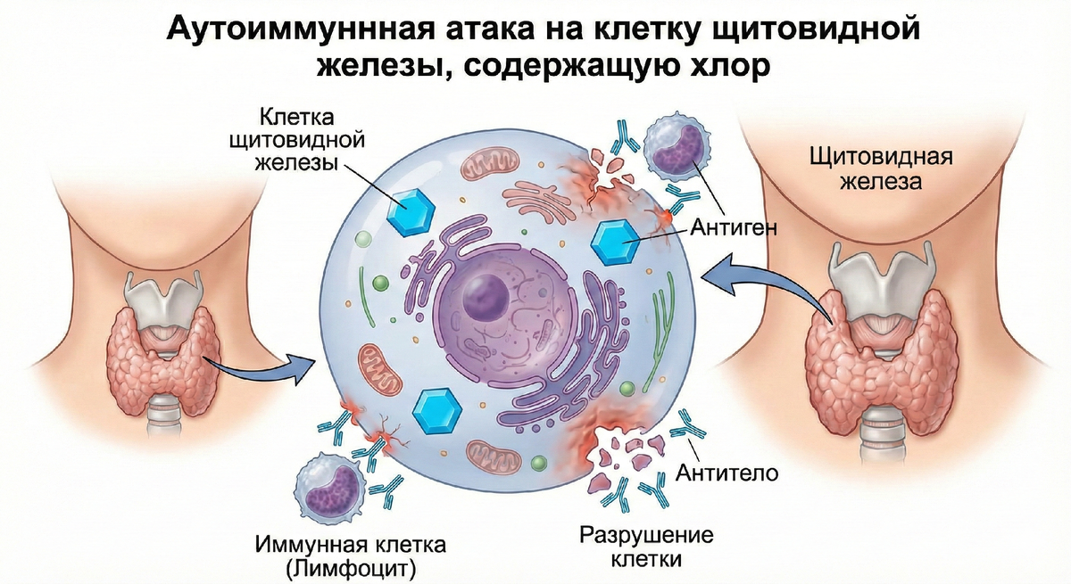 Когда клетки железы повреждены перекисью водорода и доверху напичканы токсичным фтором, хлором и бромом вместо йода, их белковая структура полностью меняется. Иммунная система — это строгий пограничник. Она смотрит на щитовидную железу и больше не узнает ее. Она видит мутировавшие клетки, переполненные галогеновыми ядами, и справедливо распознает их как антиген.