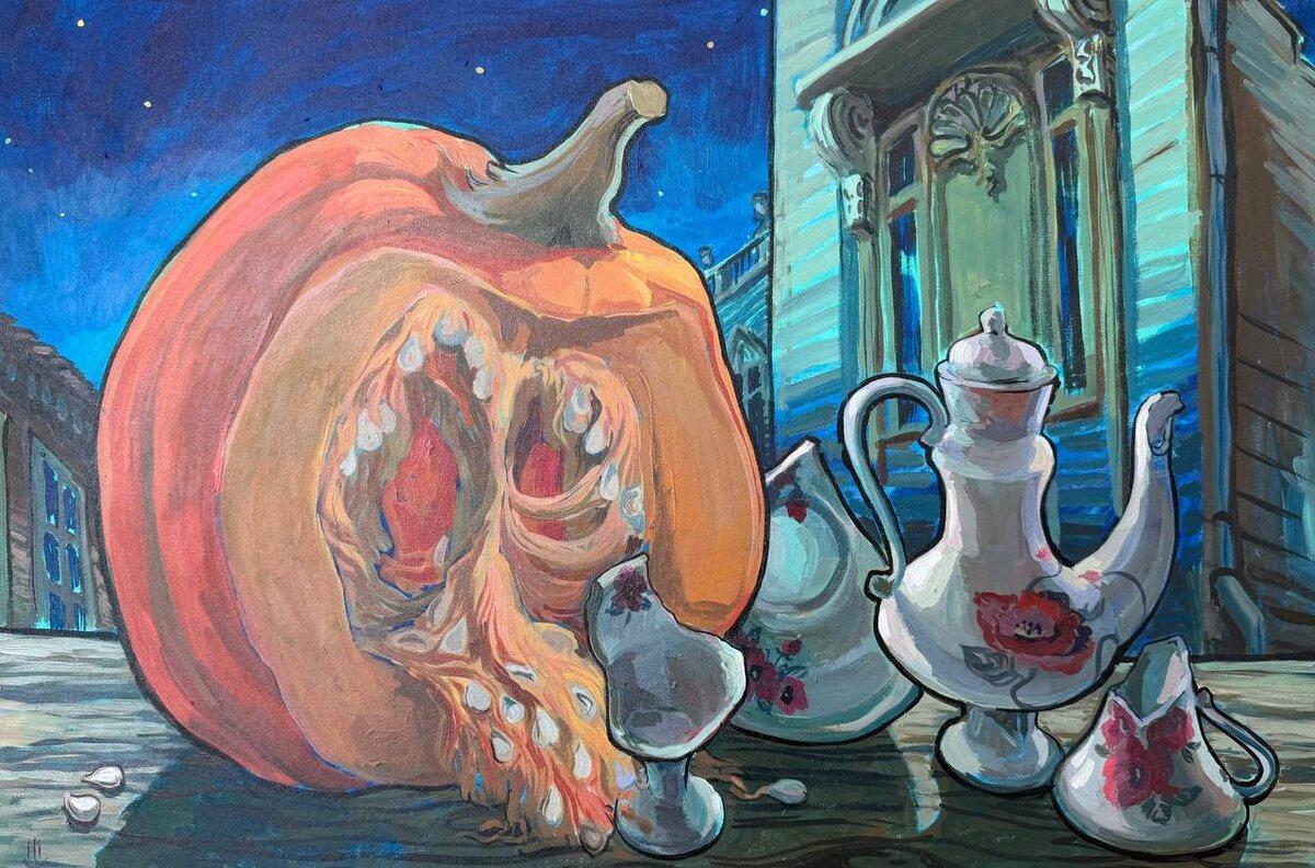 60х50 холст/акрил 2026 ••• Напрямую перекликается с названием выставки работа «Сокровища городского брюха». Разрезанная тыква, фарфор и подсвеченный лунным светом фасад заброшенного особняка воспринимаются, как находки, извлеченные из внутреннего пространства города. Здесь особенно ясно проявляется дадаистское отношение к ценности, где значимым становится случайное и уязвимое. ••• Ощутить город и прожить с ним наполненную ироничной поэзией жизнь, можно на выставке «Дада-натюрморты городского брюха» в галерее YOLKA art до 10 марта 2026. ••• Москва. Ходынский бульвар 20а, с 11:00 до 21:00 ежедневно. Выставка бесплатная, работы продаются. Вся контактная информация на сайте YOLKA.art