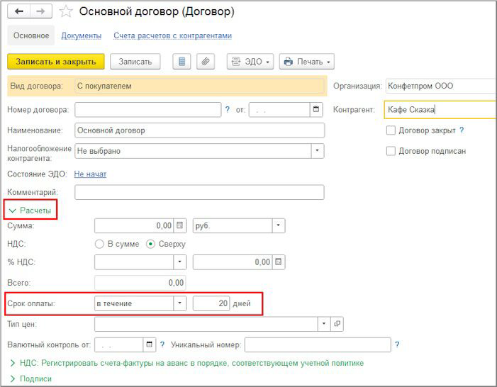 Первым делом заходим в карточку договора с контрагентом и устанавливаем срок оплаты. Это важно, потому что программа должна понимать, с какого дня считать дни просрочки.