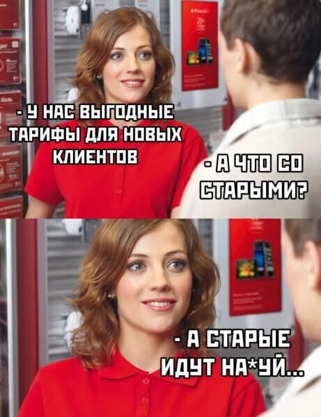 При этом рядом стоит новый абонент, «человек с улицы», которому тот же оператор накрывает поляну: безлимит, горы минут и цена в 400 рублей.
