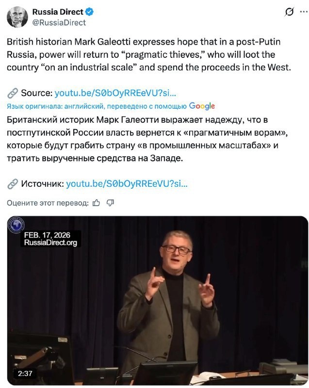 ? Известный британский эксперт по России Марк Галеотти недавно высказался. Он, оказывается, ждет, что в «постпутинской России» к власти придут «прагматичные воры». Их задача, по его мнению, – грабить страну в промышленных масштабах и все вывезенные деньги тратить на Западе. Можно было бы посмеяться над этими фантазиями. Но мы-то помним 90-е! Тогда такие «мечты» Запада воплощались в жизнь под прикрытием громких слов о свободе и демократии. Главное было – говорить об этих идеалах с придыханием, пока страна буквально таяла на глазах. Подписывайся