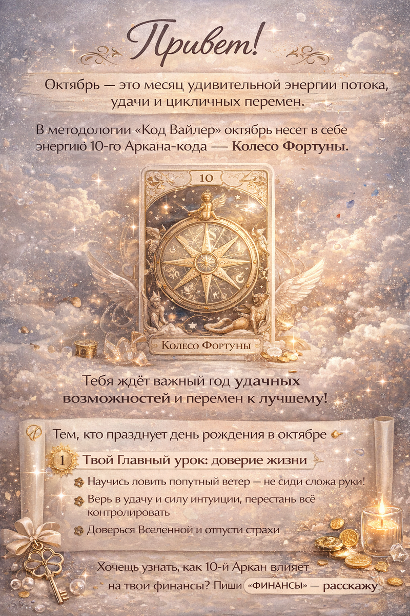 Привет! ✨ Октябрь — это месяц удивительной энергии потока, удачи и цикличных перемен. Если сентябрь вел нас в глубину и тишину, то октябрь учит нас доверять Вселенной и чувствовать ритм самой жизни. 🎡 В методологии «Код Вайлер» октябрь (10-й месяц) несет в себе энергию 10-го Аркана-кода (Колесо Фортуны). Давай разберем, что это означает для тех, кто празднует день рождения в этом месяце. 1. Главный урок (2-й код Матрицы Сознания) Для рожденных в октябре 10-й Аркан-код (Колесо Фортуны) занимает позицию Главного урока. По нашей системе этот код напрямую связан с мамой и женской линией рода. Суть урока: Научиться чувствовать свой «поток», доверять интуиции и понимать, что жизнь состоит из циклов. Твой главный вызов — перестать «грести против течения» и научиться ловить попутный ветер. Когда энергия в минусе: ⚫️ Пассивность и ожидание «манны небесной»: Человек просто сидит и ждет, что всё само упадет в руки, не предпринимая никаких шагов. ⚫️ Борьба с жизнью: Попытки всё контролировать, из