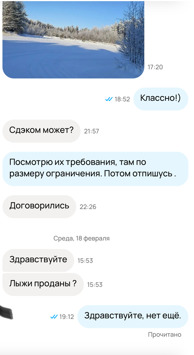 Не хочу я отправлять лыжи, доставка отключена. Захотел бы, давно подъехал и купил бы. А так, какие то переписки периодически, такое вот общение).
