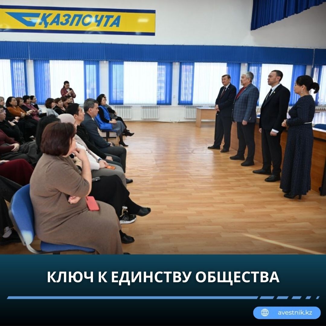 🗣 Члены региональной коалиции «За Народную Конституцию Справедливого и Прогрессивного Казахстана!» встретились с работниками «Казпочты» и разъяснили положения проекта новой Конституции. Заместитель председателя областного филиала «Қазақстан Халық партиясы» Марат Нуркеев, депутат областного маслихата Марат Койлыбаев, многодетная мама Бибигуль Калел выступили перед аудиторией. 📜 — Все самое важное отражено в проекте новой Конституции. В нем закреплены идеи справедливого государства, принцип «Закон и порядок», необходимость бережного отношения к природе, а также положение о том, что единственным источником власти и носителем суверенитета является народ Казахстана, — подчеркнул Марат Нуркеев. 🤝 Марат Койлыбаев напомнил, что фундамент государства — стабильность и согласие: — Важно, чтобы общество оставалось единым и защищенным от деструктивных религиозных течений. Мы должны создавать условия, чтобы молодые люди росли ответственными, трудолюбивыми, гордились историей и традициями свое