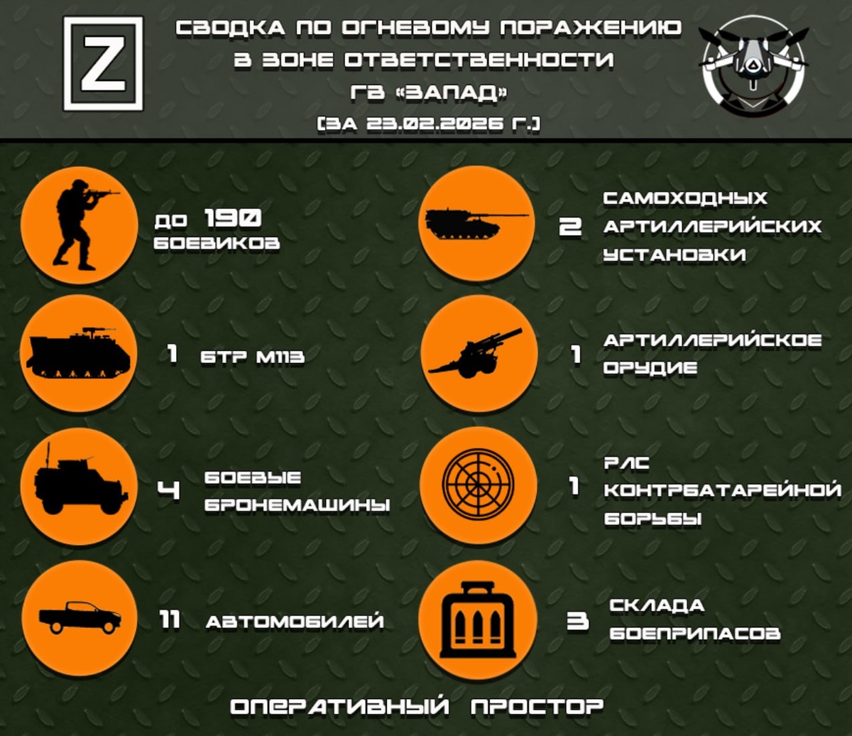 Сводка по огневому поражению в зоне ответственности ГВ «Запад» за 23.02.2026 г
