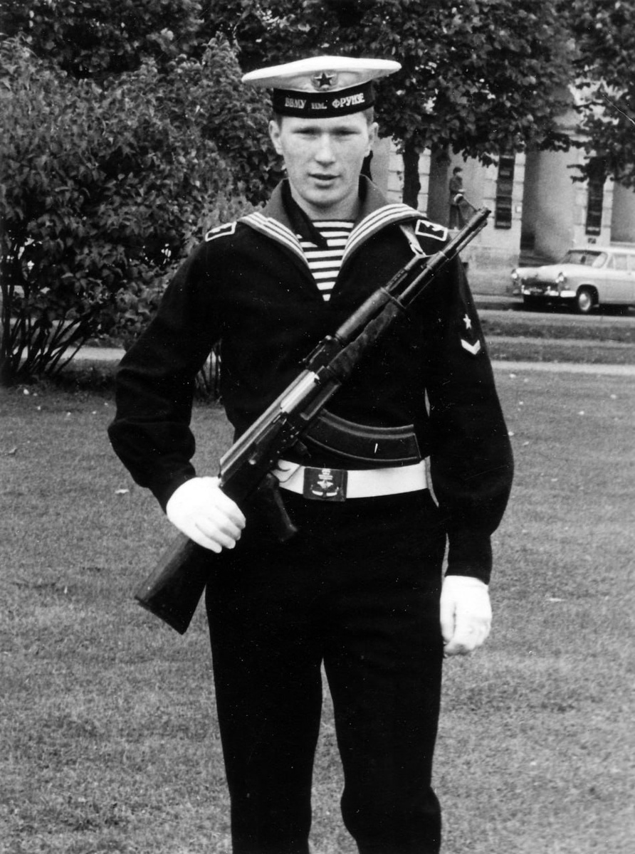 Курсант 1 курса Высшего военно-морского училища имени Фрунзе в суконной форменной рубахе с нашивными погончиками образца 1945 года